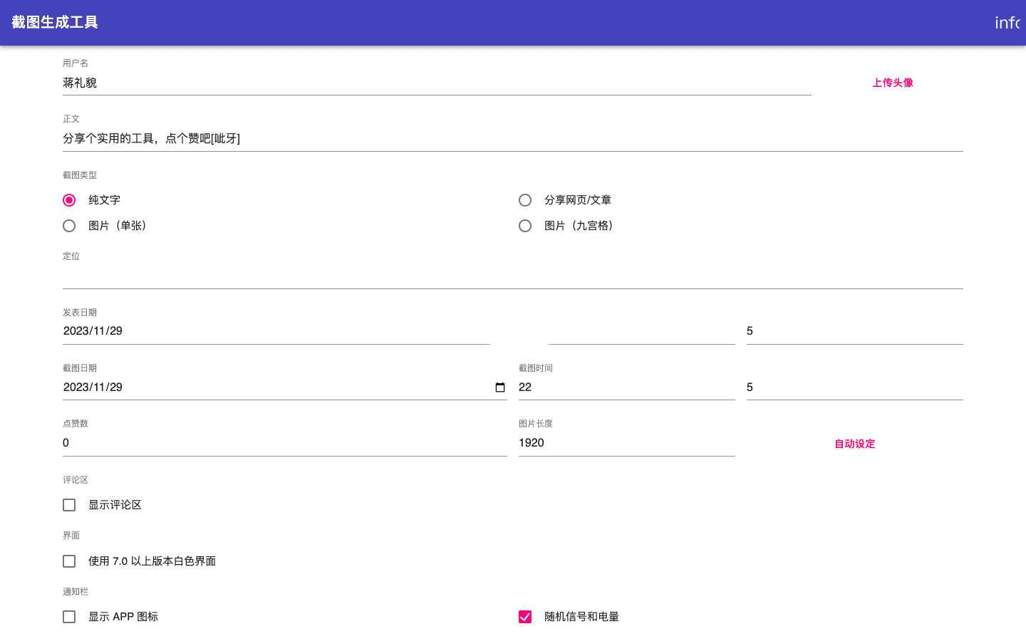 截图生成工具是一个免费模拟微信朋友圈的在线工具,可用于个人制作仿真微信朋友圈截图。它可以自定义用户名、朋友圈内容、发布时间、点赞数量、评论区内容、手机电量信息等。