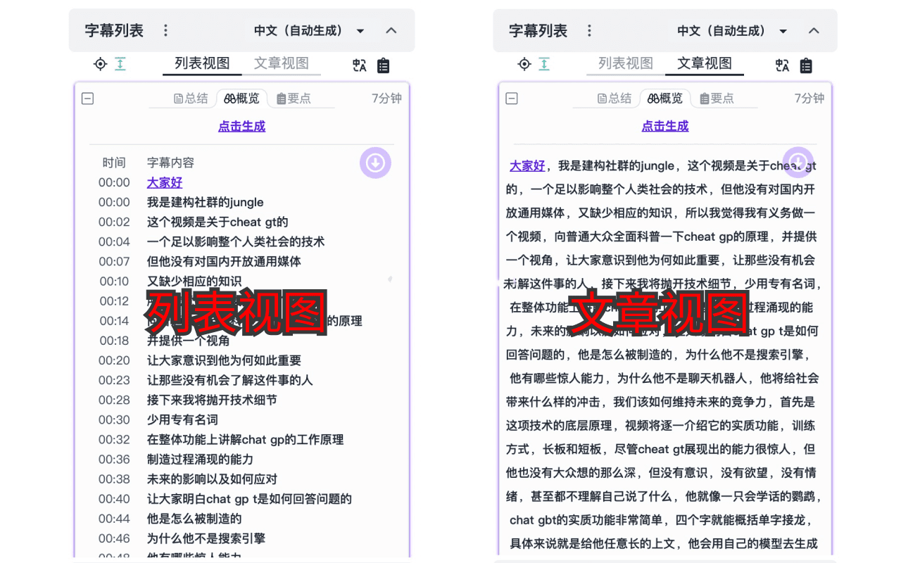 它可以显示视频对应的字幕列表,点击可跳转视频对应位置,比较适合知识学习类的视频。
