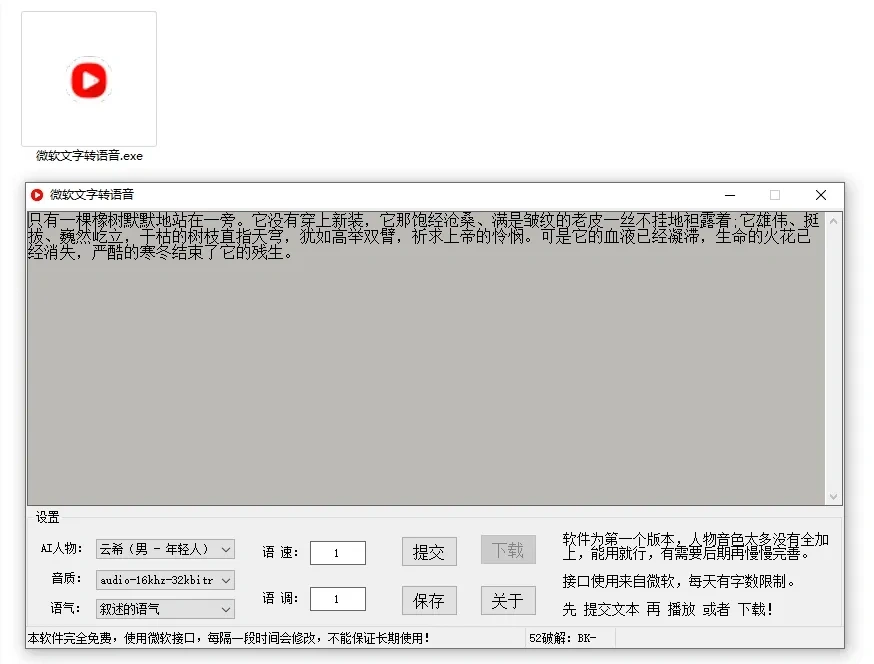 这款软件完全免费,无需安装程序,使用起来极为方便快捷,体积小巧。该软件采用微软接口,不过每个 IP 每天存在字数限制。现在很多的文字转语音工具失效了,难得的又有一款,但是微软接口经常变更,有需要的可以先收藏,我也会持续给大家更新。