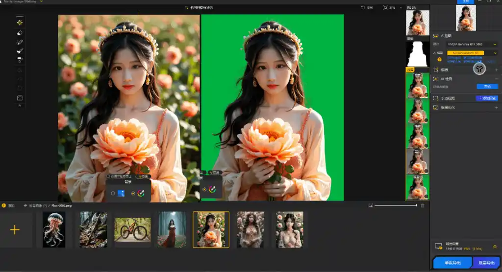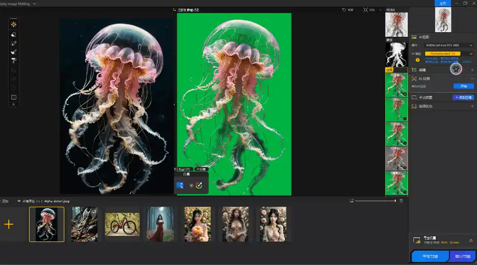 - 高精度 Alpha 抠图:通过动态透明度控制和边缘优化,即使在困难的边缘情况下,也能更进一步。这确保了出色的细节保留并使背景集成无缝。