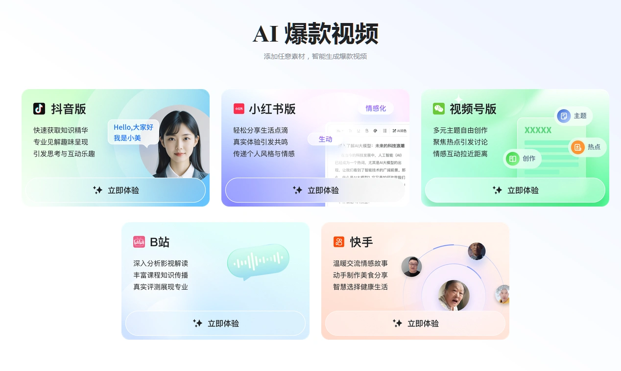 AI爆款视频是一款AI视频生成工具,添加任意素材,一键智能生成爆款视频工具,支持抖音、小红书、视频号、B站和快手等平台视频生成,支持自媒体、财经评论、影视剧情、经验攻略和搞笑娱乐主题生成,使用也非常简单,冲素材获取,文案生成、标题生成、视频生成,整个流程都是一键搞定,非常实用。