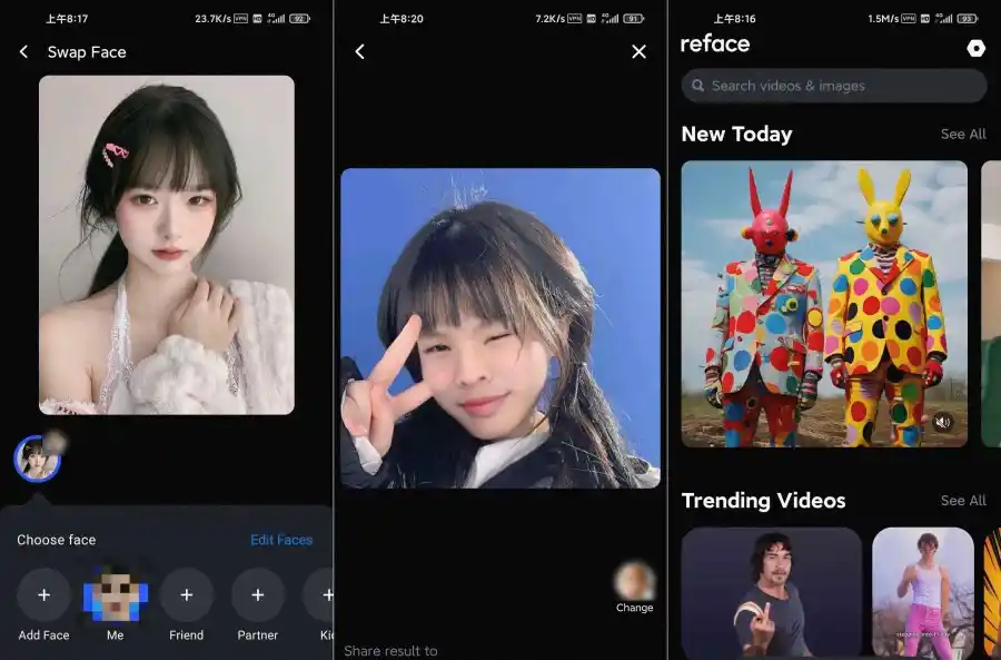 Reface是一款非常有趣的换脸工具。你可以用它来对自己或者朋友的照片进行换脸处理,不仅可以用来美化,还可以用它来进行搞怪,而且当你想要试一款网络上的衣服商品时,直接一键换脸,就能知道那件衣服适不适合你了。