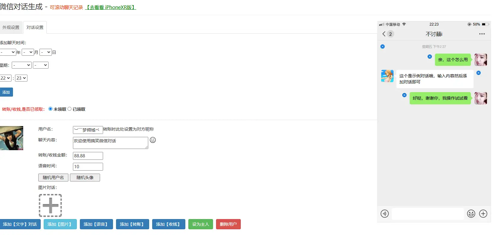 - 🔧 多种类型截图生成:支持微信、支付宝等平台的聊天记录和转账截图生成。