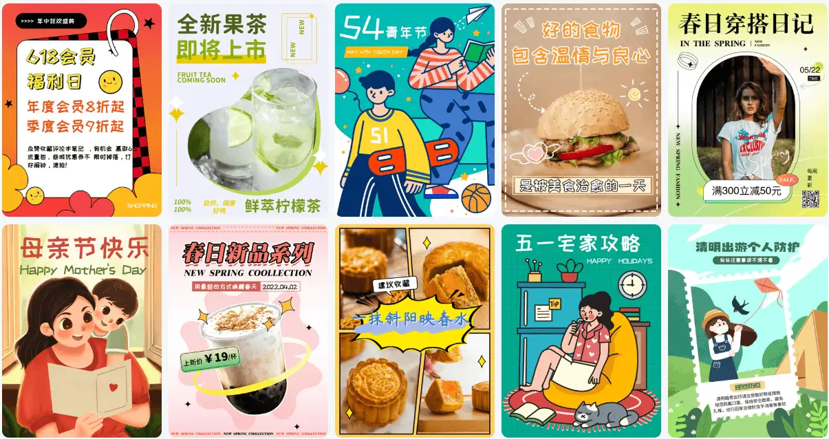 • 小红书风格模板:涵盖时尚、美妆、美食、旅行等热门领域。