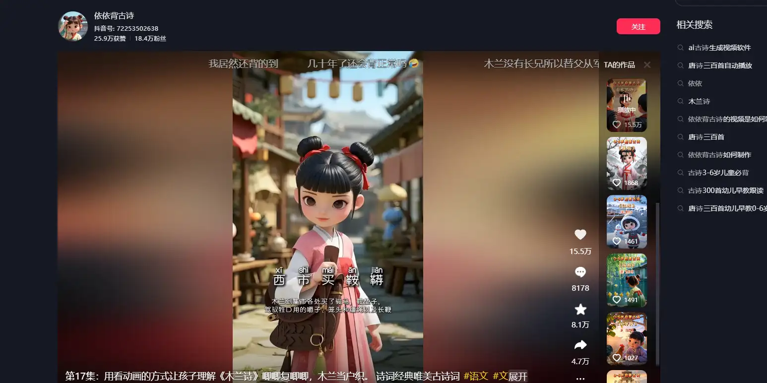- 平台赚钱:在抖音、快手、B站等平台发布高质量AI古诗词视频,吸引粉丝关注,获得流量收益和平台奖励。