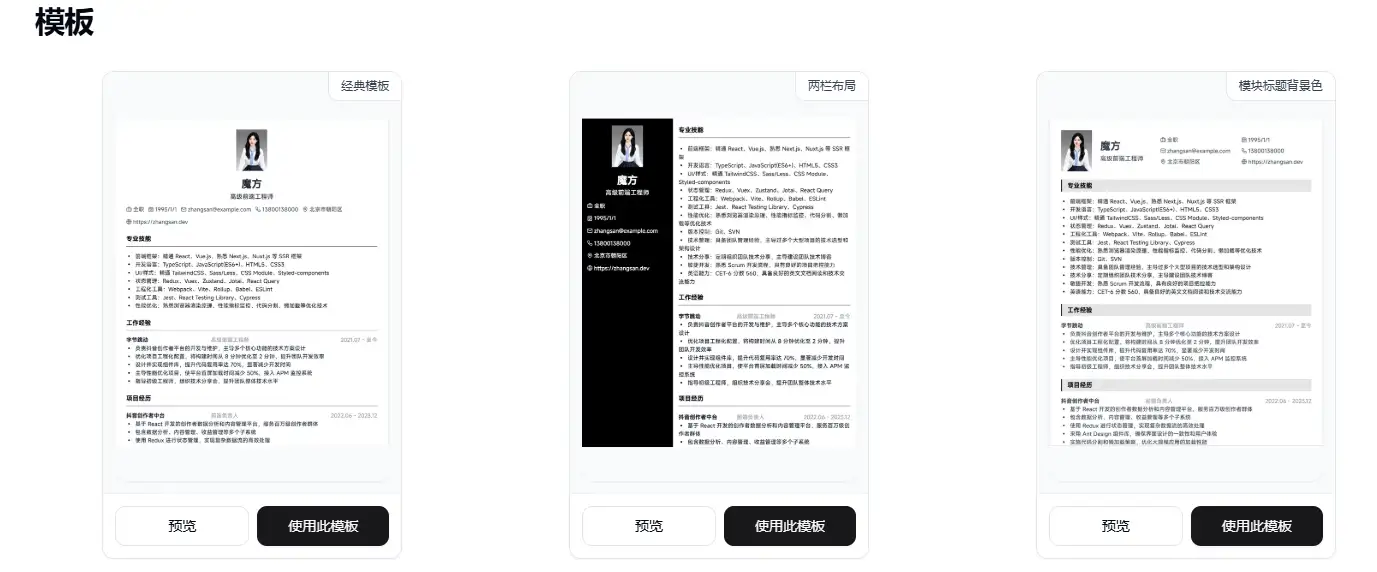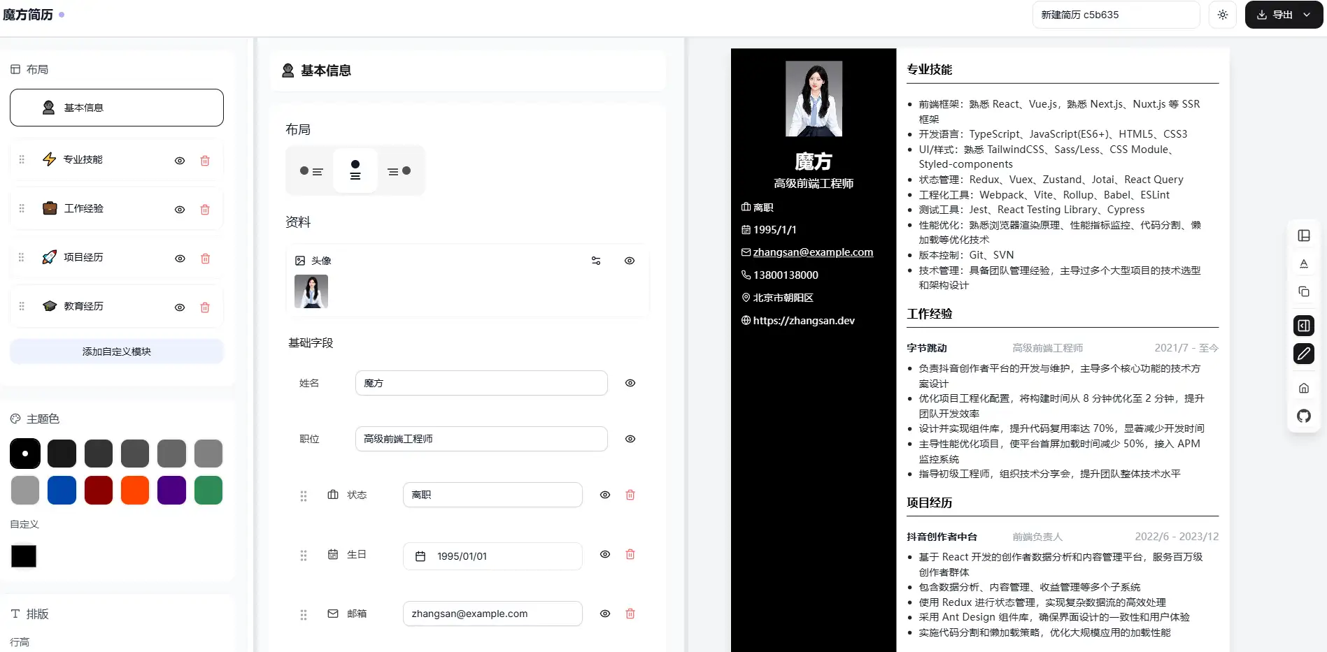 - 支持自定义主题,调整颜色、布局,打造个性化简历。