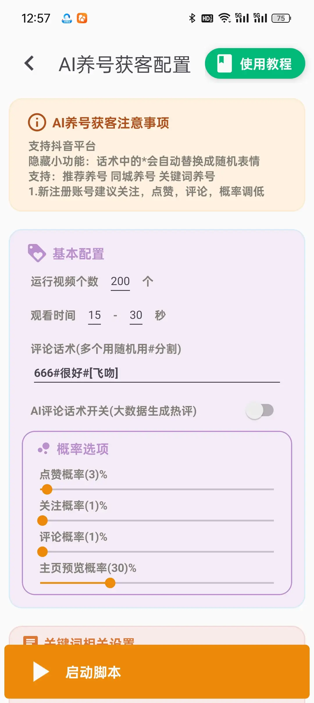 🚀 养号模式:支持自定义养号标签,垂直关键词随机点赞、关注、评论、收藏、主页点击等业务,帮助账号快速打标并提升活跃度。