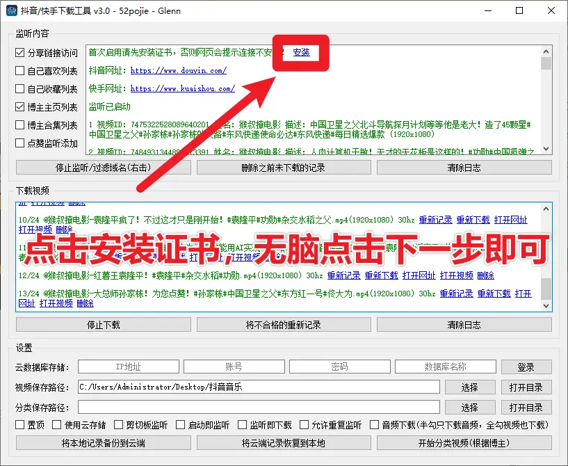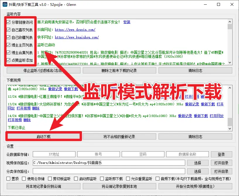 - 在抖音或快手平台打开视频或列表页面,软件自动监听并解析下载。