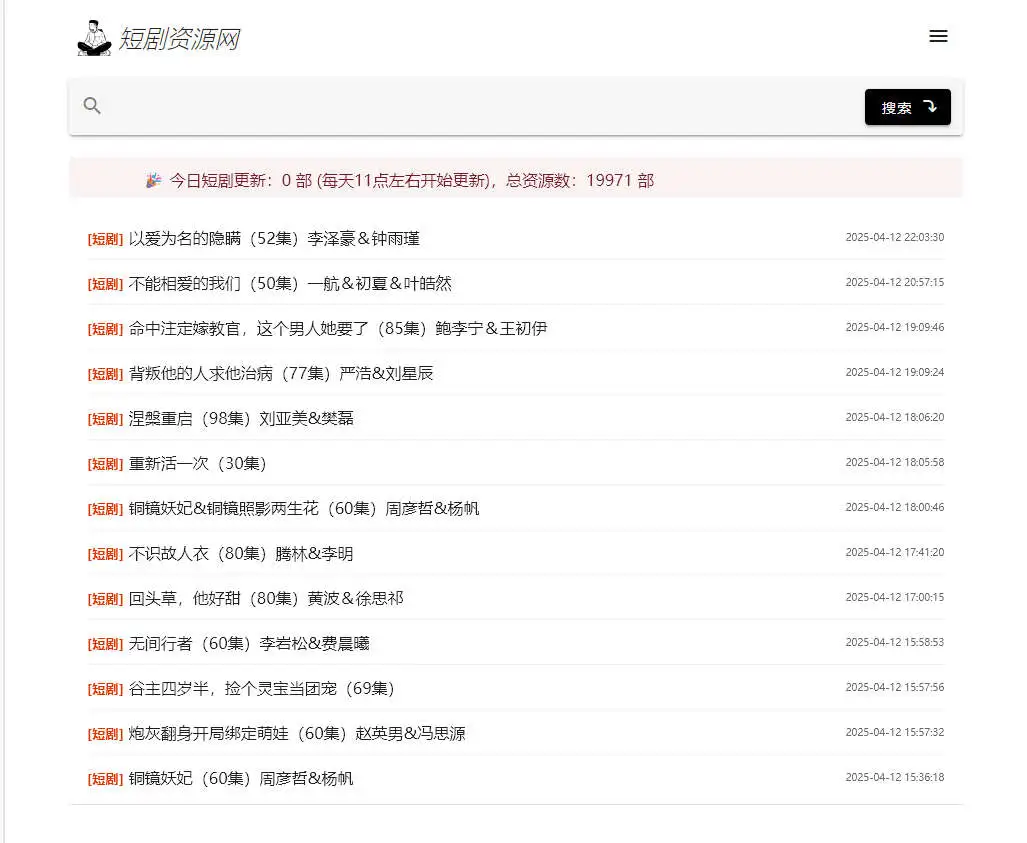 这是一个覆盖广、更新快、使用方便的短剧资源站,提供免费、高清、丰富多样的短剧资源,涵盖了都市剧、古装剧、悬疑剧、爱情剧、校园剧等各种题材,满足你多样化的观影需求!