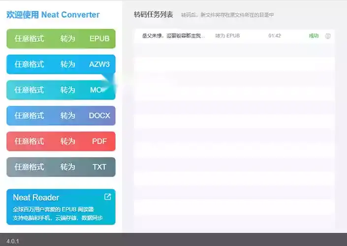 - 多格式互转:支持电子书领域 EPUB/AZW3/MOBI 格式与办公文档 DOCX/PDF/TXT 之间的双向转换。
