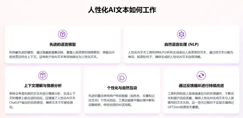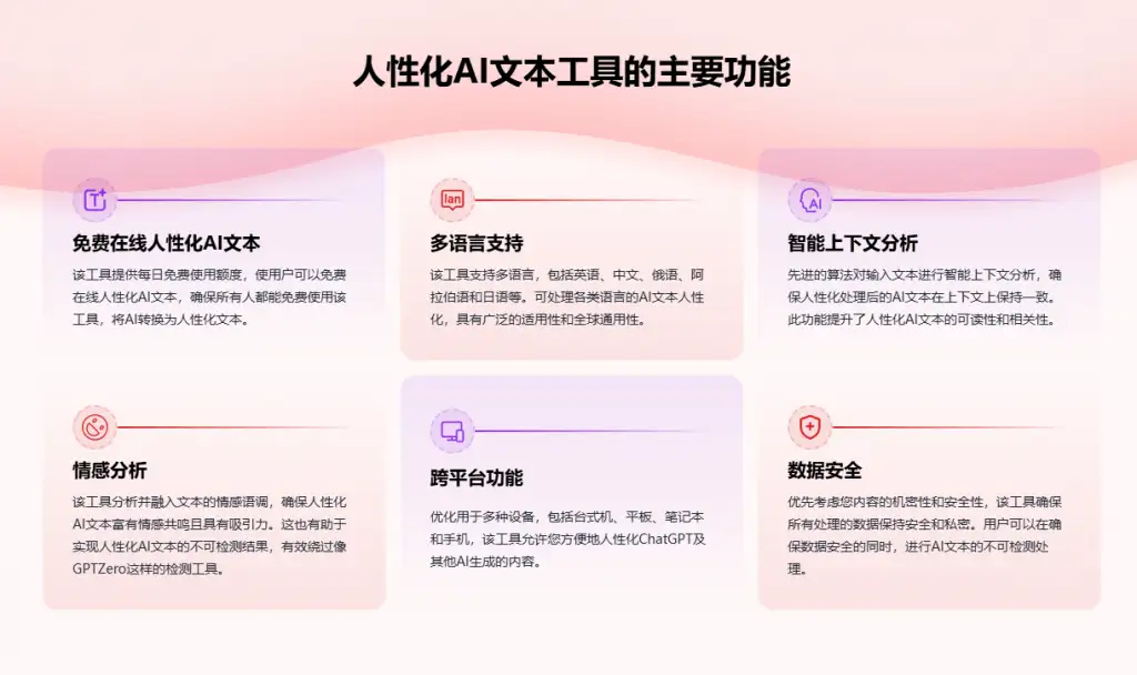 1. 功能多样:支持多语言、情感分析以及上下文优化,全方位确保文本自然且难以被检测出来。