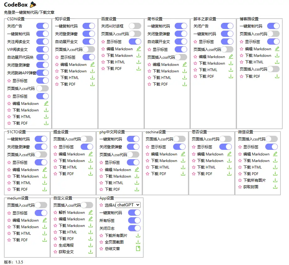 • 支持免登录、一键复制代码、关闭广告、关注阅读全文、自动展开代码块、关闭登录弹窗和下载等操作