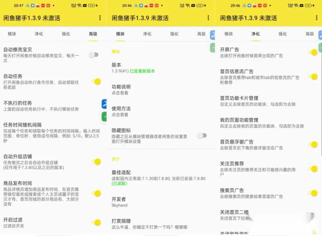 原则上,闲鱼助手只适配于 7.1.30 – 7.8.80 版本的闲鱼。不过在实际使用中,其他版本也可能可行。需要注意的是,老版本直接登录不上,所以需要进行覆盖安装登录。