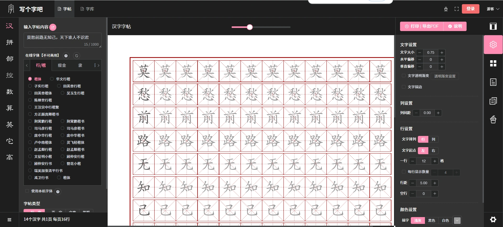 当前位置: 首页全部分类在线工具正文 一个超强的字帖生成器 支持汉字帖、拼音帖、偏旁部首帖、英文字帖; 可生成算术题,生成后支持高清PDF下载 也可以直接在线打印,总之很强。 网站地址:https://xgzb.top/ 声明:本站所有文章,如无特殊说明或标注,均为本站原创发布。任何个人或组织,在未征得本站同意时,禁止复制、盗用、采集、发布本站内容到任何网站、书籍等各类媒体平台。如若本站内容侵犯了原著者的合法权益,可联系我们进行处理。 admin会员 收藏 链接