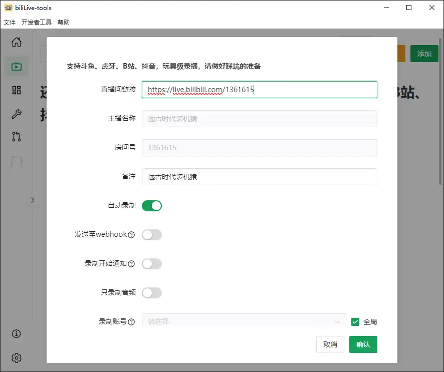 - 支持斗鱼、虎牙、B站、抖音直播录制