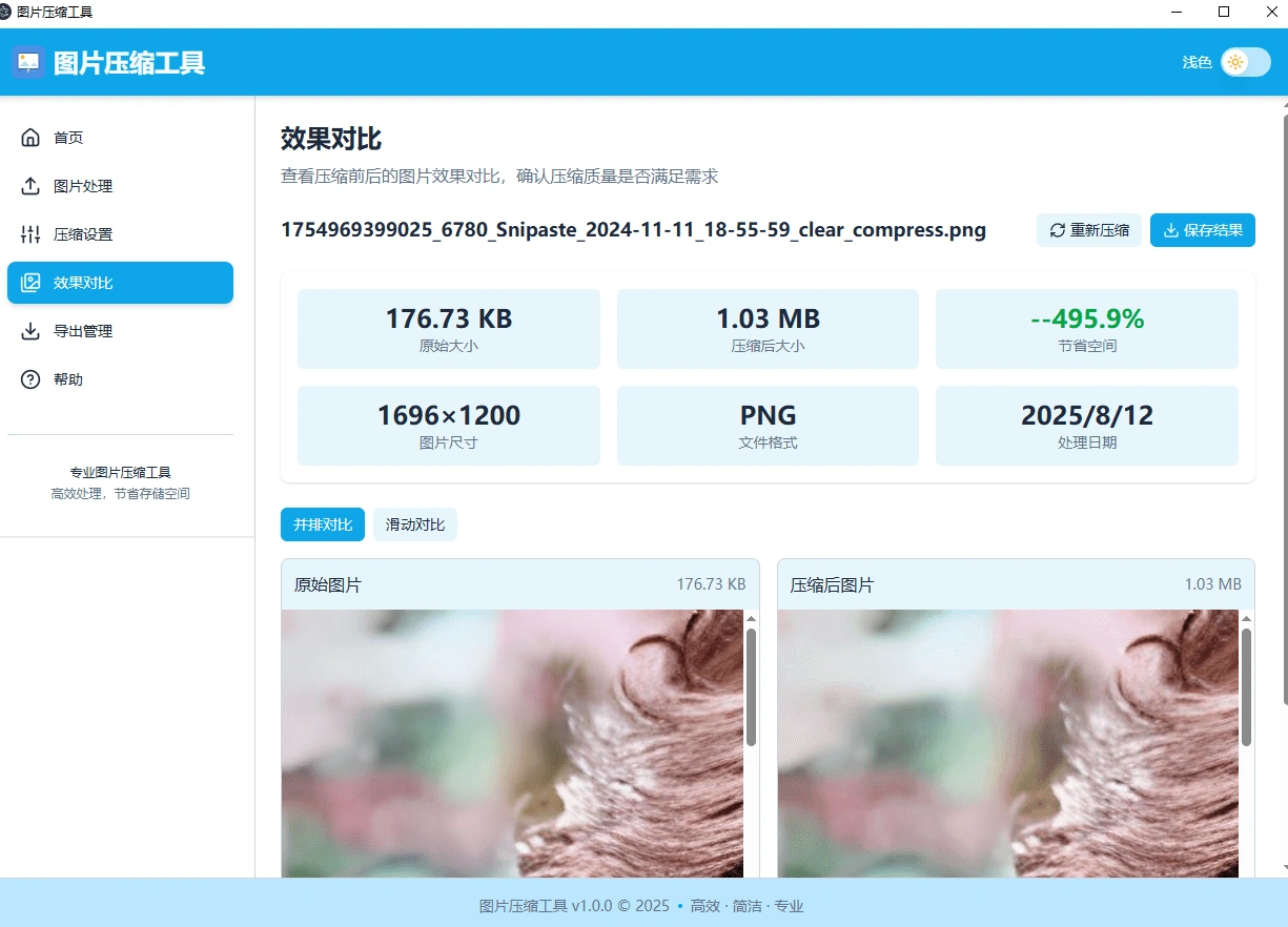 - 💪 更优压缩效果 – 实测同一张图片,LocalSqueeze 压缩至 104KB,TinyPNG 压缩至 175KB,质量无差异