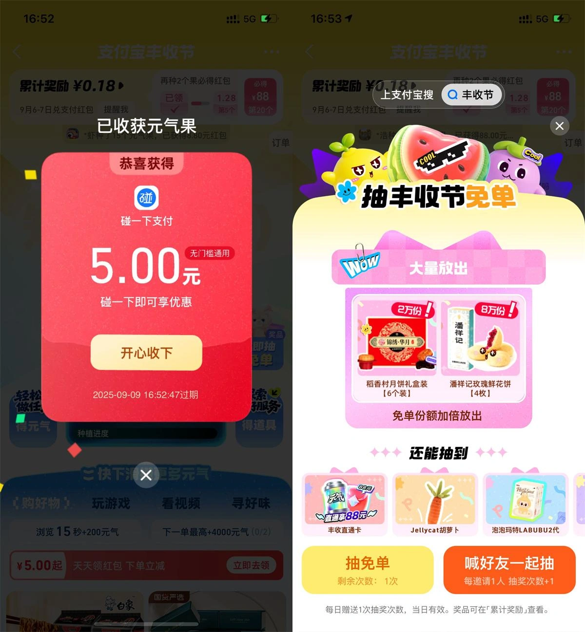 当前位置: 首页全部分类实操项目正文 支付宝搜索“丰收节”->每天浏览得元气,升级抽红包等奖励->右侧还可以抽实物免单 声明:本站所有文章,如无特殊说明或标注,均为本站原创发布。任何个人或组织,在未征得本站同意时,禁止复制、盗用、采集、发布本站内容到任何网站、书籍等各类媒体平台。如若本站内容侵犯了原著者的合法权益,可联系我们进行处理。 admin会员 收藏 链接