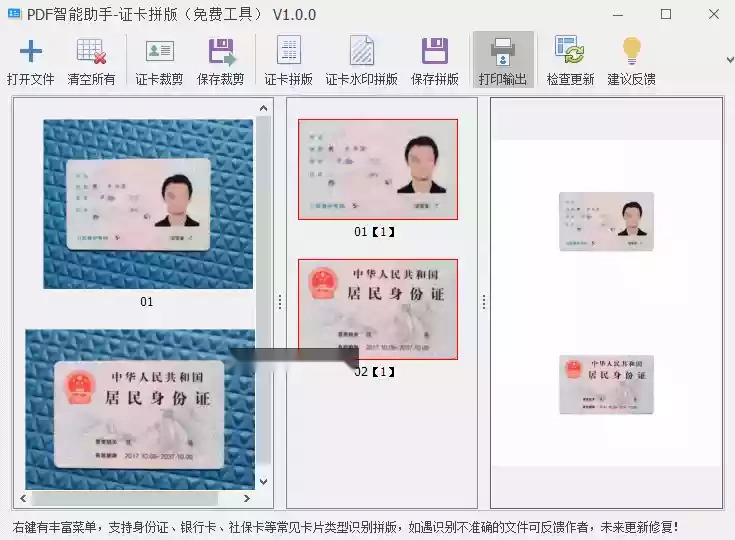 当前位置: 首页全部分类实操项目正文 在 2025 年,PDF 智能助手成为证卡拼版的利器,极大地简化了打印店的工作流程。这款工具可以智能地对证件卡照进行拼版,然后直接打印,省去了繁琐的操作步骤。 工具特点: 智能拼版自动识别并拼接身份证、银行卡等证件,无需手动操作。 一键处理用户只需拍好照片,工具即可自动处理并生成 A4 纸张的拼版文件。 高效便捷省去了传统 PS 抠图、排版的繁琐步骤,大幅提升工作效率。 打印优化生成的拼版文件可直接打印,确保打印效果清晰、整齐。 使用场景: 打印店:快速处理客户的证卡拼版需求,提升服务质量。 企业办公:批量处理员工证件照,节省时间和人力成本。 个人使用:轻松制作证件拼版文件,方便日常打印。 使用建议: 拍摄照片:确保证件照片清晰、完整,避免模糊或遮挡。 一键处理:上传照片后,工具将自动完成拼版处理。 打印文件:直接打印生成的拼版文件,确保效果完美。 会员全站资源免费获取,点击查看会员权益 普通用户可在下方单独购买课程! 隐藏内容此处内容需要权限查看普通用户特权:9.8积分会员用户特权:免费网站代理用户特权:免费推荐登录后购买 声明:本站所有文章,如无特殊说明或标注,均为本站原创发布。任何个人或组织,在未征得本站同意时,禁止复制、盗用、采集、发布本站内容到任何网站、书籍等各类媒体平台。如若本站内容侵犯了原著者的合法权益,可联系我们进行处理。 admin会员 收藏 链接