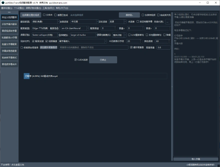 当前位置: 首页全部分类实操项目正文 本工具是一个开源的自动视频翻译项目,支持将一种语言的视频翻译为指定语言的视频,并自动生成新语言字幕与配音。支持各种语言,提供绿色免安装版,效果显著。 工具特点: 语言支持支持多种语言翻译,自动生成字幕与配音。 技术基础语音识别基于 openai-whisper 离线模型,文字翻译使用 Google 翻译接口,文字合成语音使用 Microsoft Edge tts,背景音乐去除使用 Spleeter。 平台支持目前仅支持 Windows 平台,绿色免安装版本。 功能强大支持音视频分离、字幕翻译、一键翻译并配音生成视频等功能。 会员全站资源免费获取,点击查看会员权益 普通用户可在下方单独购买课程! 隐藏内容此处内容需要权限查看普通用户特权:9.8积分会员用户特权:免费网站代理用户特权:免费推荐登录后购买 声明:本站所有文章,如无特殊说明或标注,均为本站原创发布。任何个人或组织,在未征得本站同意时,禁止复制、盗用、采集、发布本站内容到任何网站、书籍等各类媒体平台。如若本站内容侵犯了原著者的合法权益,可联系我们进行处理。 admin会员 收藏 链接