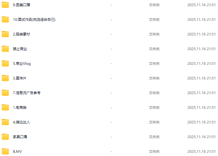 真实行业素材包含电商、服装、宣传片、达人、商业Vlog、信息流广告、MV、医美口播、家具口播等,已经整理成了素材合集,包括素材和剪辑好的成品,可以供我们学习使用和练习使用,还是很不错的内容,收集这一份分享给大家。