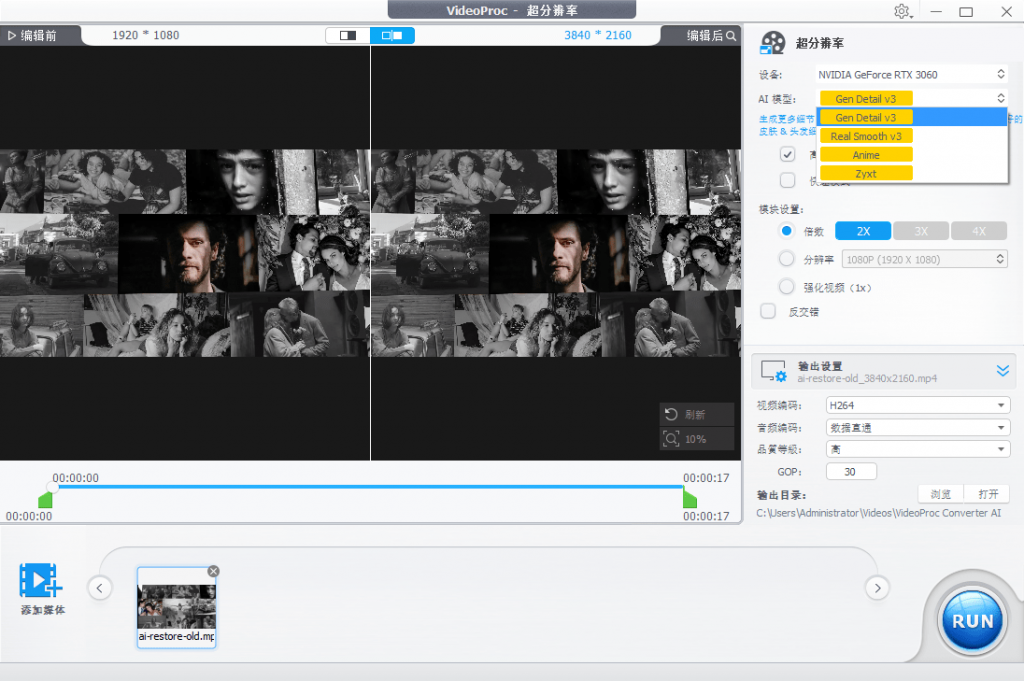 - 支持4K视频高清修复、图片无损放大、老照片上色等,而且支持GPU加速